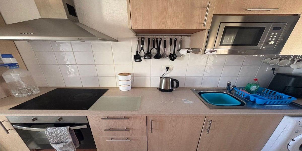 Cocina independiente totalmente equipada con acceso a un jardín privado embaldosado